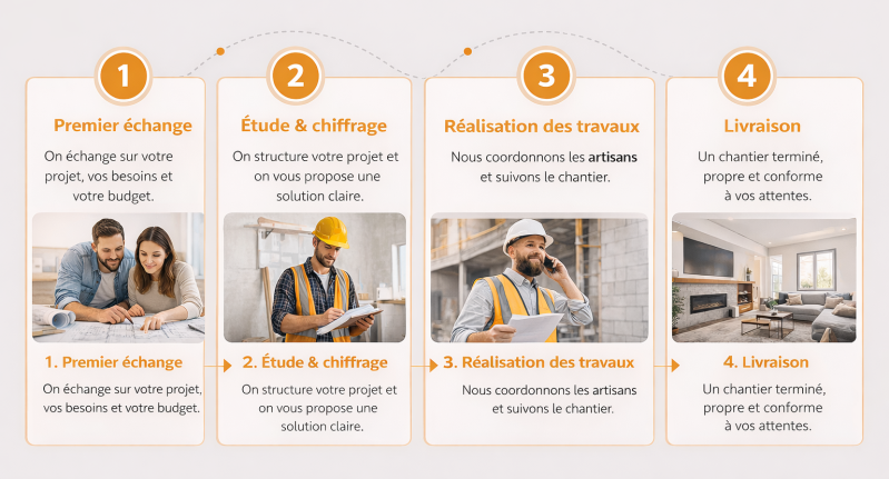 Chaque étape est structurée en amont pour vous garantir un chantier maîtrisé, sans imprévu.